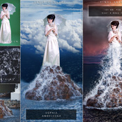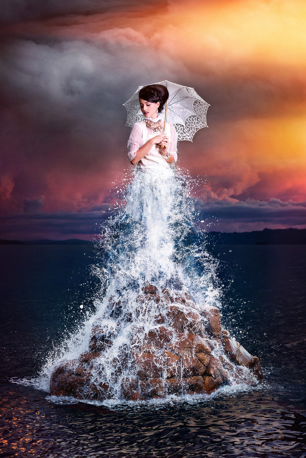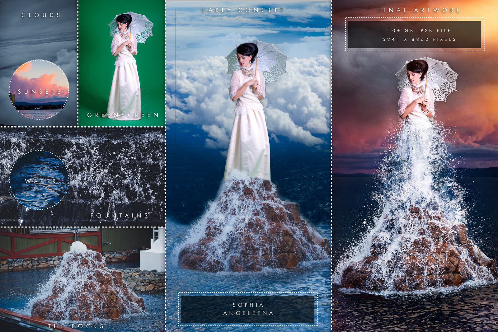 Early on a Saturday morning Liz and I got up at 4:30am to head to Sydney. It was pouring with rain, and the GPS wanted to send us in loops; but we made it safely, and met up with the rest of the team. We shot with Sophia against a green screen, and in post I built up a scene at a high resolution so that the file would be more flexible later on. The image was slowly built up from the ground with layers upon layers, masks, and various blending modes. Other than the shot of Sophia I took the rest of the photos on a trip to Queensland with my dad, brother, and sister, just before her wedding. The dress and foreground were created with photos captured at Movie World and Sea World of various fountains. The distant ocean and clouds were captured from the plane, while the horizon was the view we had from our resort.